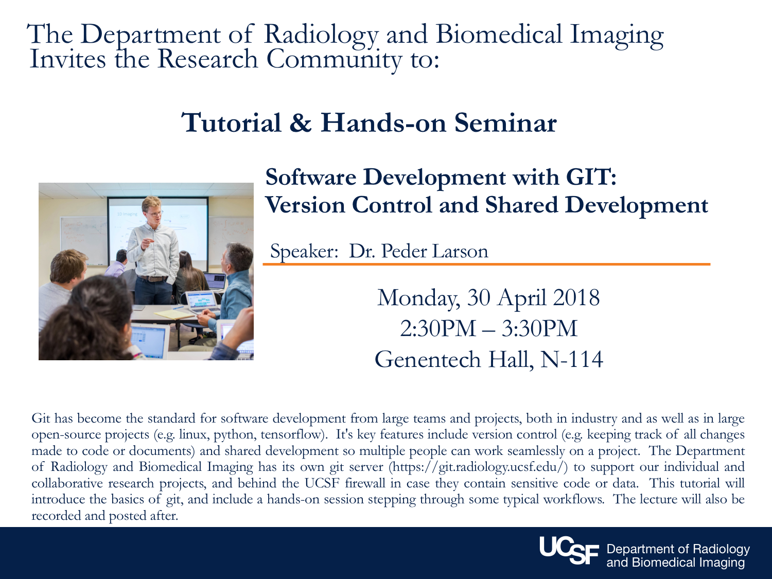 Join Dr. Peder Larson on Monday, April 30th at 2:30 p.m. for his Tutorial & Hands-on Seminar on Software Development with GIT: Version Control and Shared Development. Git has become the standard for software development from large teams and projects, both in industry and as well, in large open-source projects (e.g. linux, python, tensorflow). Its key features include version control (e.g. keeping track of all changes made to code or documents) and shared development so multiple people can work seamlessly on a project. The Department of Radiology and Biomedical Imaging has its own git server (https://git.radiology.ucsf.edu/) to support our individual and collaborative research projects, and behind the UCSF firewall in case they contain sensitive code or data. This tutorial will introduce the basics of git, and include a hands-on session stepping through some typical workflows. The lecture will also be recorded and posted after. The seminar will be held at N-114 of Genentech Hall, Mission Bay.